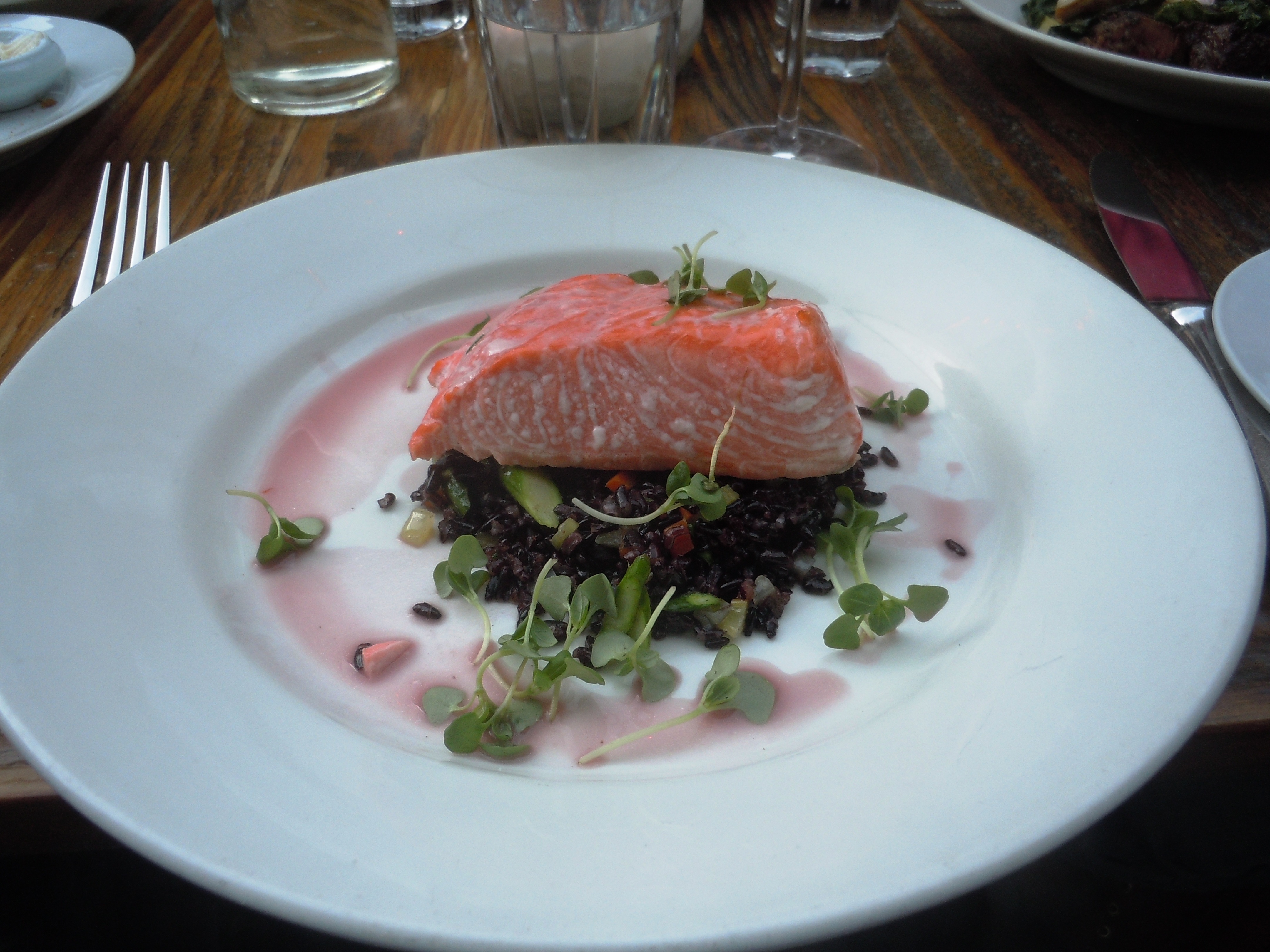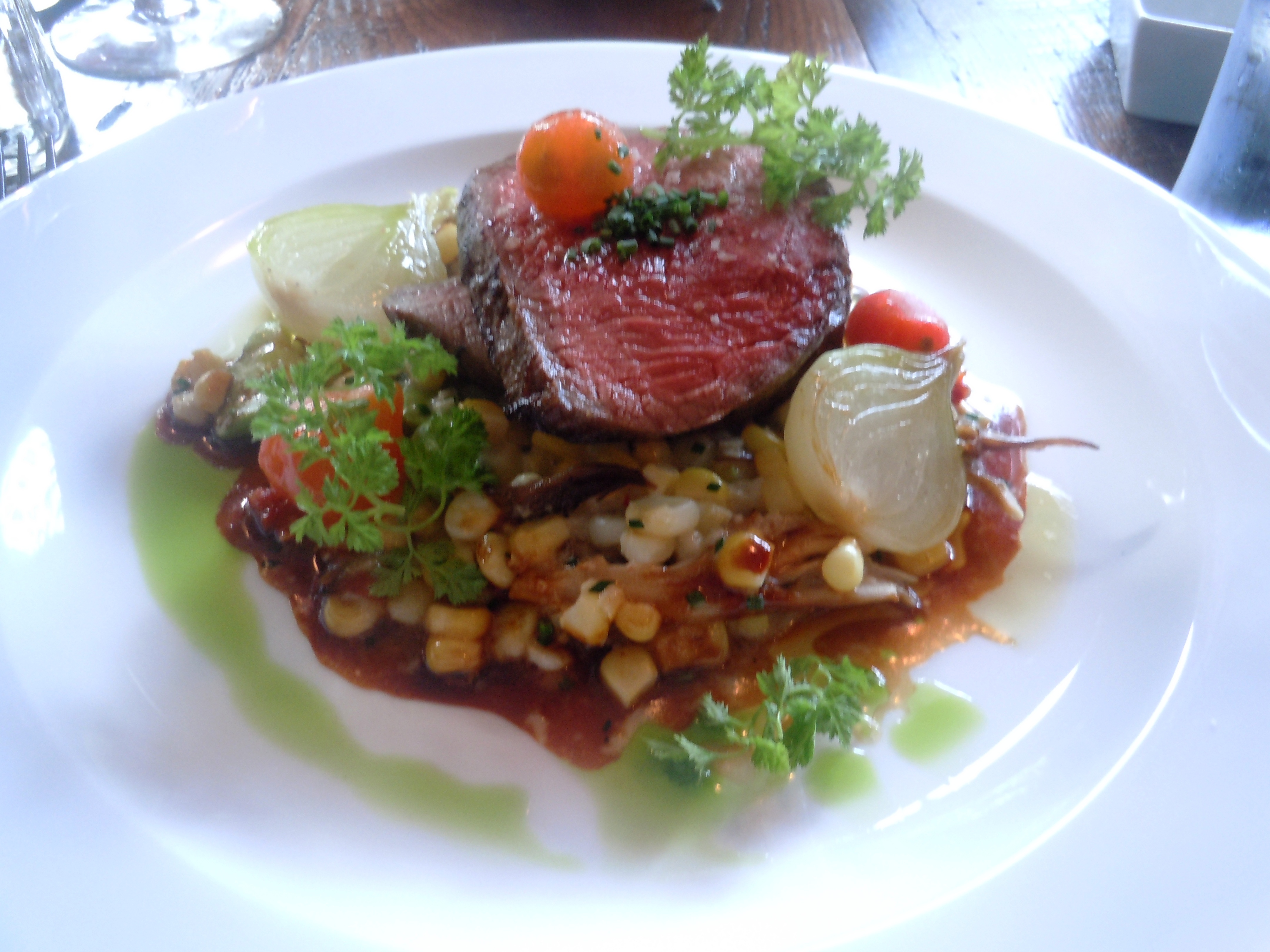 My dad got the spicy P.E.I. mussels to start, which were delicious—really flavorful and fresh, without being too fishy or salty. The garlic bread accompaniment, dipped in the broth, was amazing. For his entrée he got the pan-seared scallops (crispy farm egg, chorizo emulsion, shallot-radish salad, fresh & freeze dried corn) which were fresh and perfectly seared, with lots of flavor. The crispy farm egg was a poached egg that was lightly fried, so when you cut into it the yolk came oozing out. Delicious.