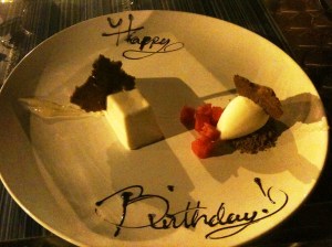 For dessert, we got the Chèvre Cheesecake (with graham cracker tuile, compressed melon and lemongrass ice cream), which was impossibly creamy and delicious. It was the perfect portion—a few sweet after-dinner bites that don’t tip you over the edge into uncomfortably full—and was presented beautifully, even down to the “Happy Birthday” in chocolate.